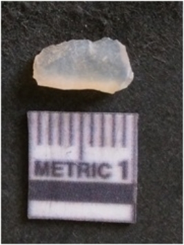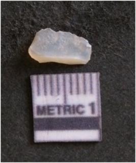 | Description / विवरण | The chalcedony flake is pale in color and translucent in appearance. The piece has s harp flaked ends and a bulbous end due to flaking. The flake has a crypto-crystalline silica matrix with translucent white in color. |