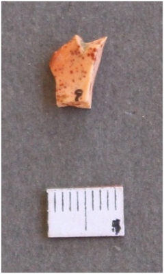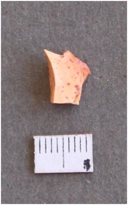 | Description / विवरण | It is a small reddish fragment, with sharp flaked edges. |