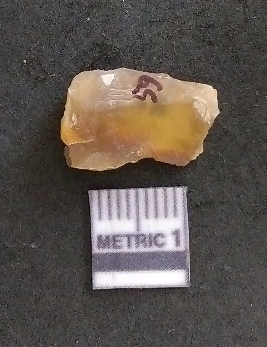 | Description / विवरण | It is a chalcedony flake, with a bulb of percussion on the ventral side. Cortex on one end. |