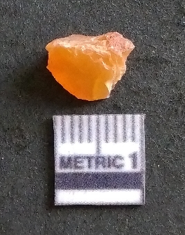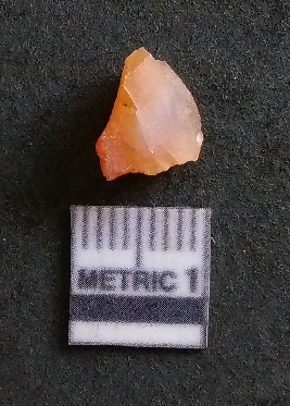 | Description / विवरण | It is a carnelian flake, with a striking platform with bulb of percussion on the ventral side. It is orangish in color, flake edges on the surface with ripple on it due to heavy percussion. |