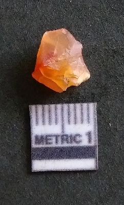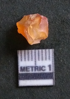 | Description / विवरण | It is a carnelian flake, with a striking platform with bulb of percussion on the ventral side. It is orangish in color, flake edges on the surface with ripple on it due to heavy percussion. |