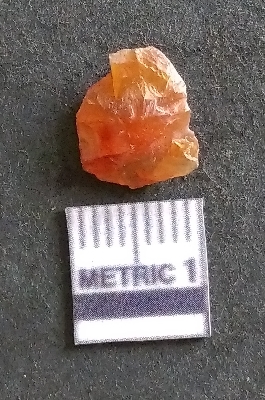 | Description / विवरण | It is a carnelian flake, with a striking platform with bulb of percussion on the ventral side. It is orangish in color, flake edges on the surface with ripple on it due to heavy percussion. |