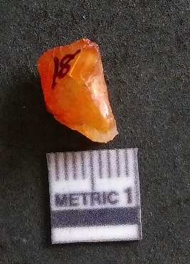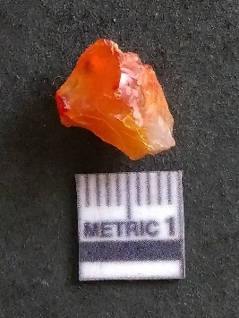 | Description / विवरण | It is a carnelian flake, with a striking platform with bulb of percussion on the ventral side. It is orangish in color, flake edges on the surface with ripple on it due to heavy percussion. |
