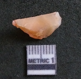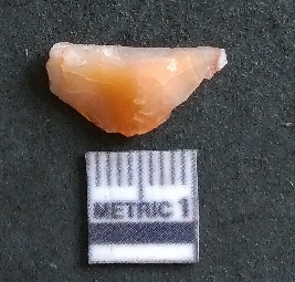 | Description / विवरण | It is a carnelian flake, with a striking platform with bulb of percussion on the ventral side. It is orangish in color, flake edges on the surface with ripple on it due to heavy percussion. |