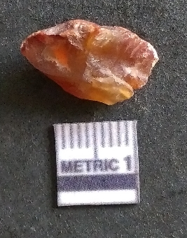 | Description / विवरण | It is a carnelian flake, with a striking platform with bulb of percussion on the ventral side. It is orangish in color, flake edges on the surface with ripple on it due to heavy percussion. |