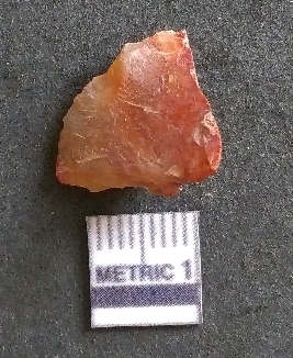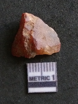 | Description / विवरण | It is a carnelian flake, with a striking platform with bulb of percussion on the ventral side. It is orangish in color, flake edges on the surface with ripple on it due to heavy percussion. |