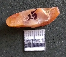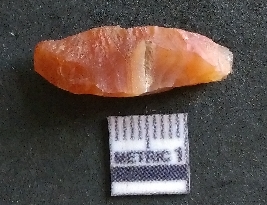 | Description / विवरण | It is a carnelian flake, with a striking platform with bulb of percussion on the ventral side. It is orangish in color, flake edges on the surface with ripple on it due to heavy percussion. |