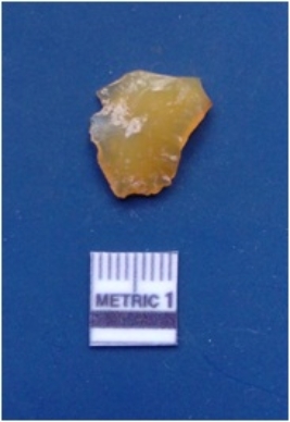 | Description / विवरण | It is a chalcedony fragment, having positive bulb of percussion on the ventral side. Heat treatment done on the fragment, prominent flake scars with ripples on the surface. Sharp edges and pointed ends. |