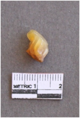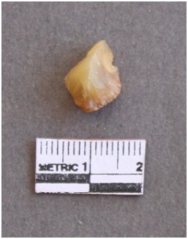 | Description / विवरण | It s a chert fragment, with a striking platform, cortex on one end; there are many flake scars with ripples on them. |