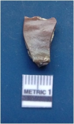 | Description / विवरण | It is a chert fragment having positive bulb of percussion on the ventral side with flake ridges with prominent ripples visible on them. Sharp edges with pointed ends. |