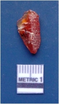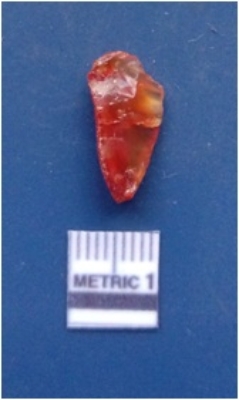 | Description / विवरण | It is a carnelian fragment, translucent in appearance. Heat treatment done on the fragment. Flake scars visible on the surface with ripples on them. Sharp edges and pointed ends. Cortex on partly one side of the surface. |
