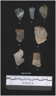 | Description / विवरण | It is a chert flake, with a striking platform, cortex on one end; there are many flake scars with ripples on it. |