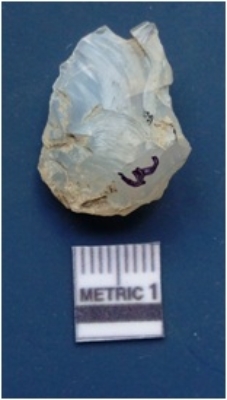 | Description / विवरण | It is a milky quartz, translucent in appearance. Bulb on the ventral side. Prominent flake scars visible on the surface. |