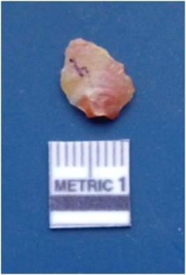 | Description / विवरण | It is a chert fragment. Having prominent flake scars on the surface with ripples visible on it. Heat treatment done on it. It has sharp lateral margins with pointed ends. The fragment has positive bulb of percussion with erailuer feature. |