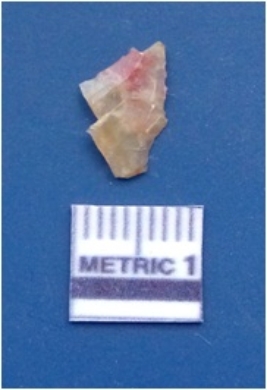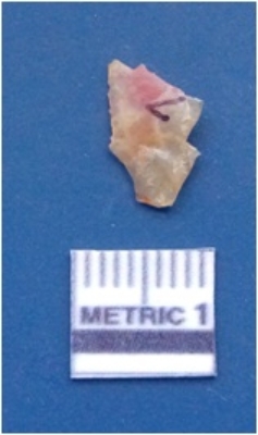 | Description / विवरण | It is a agate fragment. Having prominent flake scars on the surface with ripples visible on it. Heat treatment done on it. It has sharp lateral margins with pointed ends. The fragment has positive bulb of percussion with erailuer feature. |