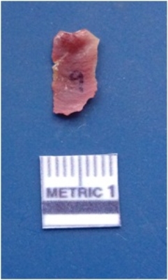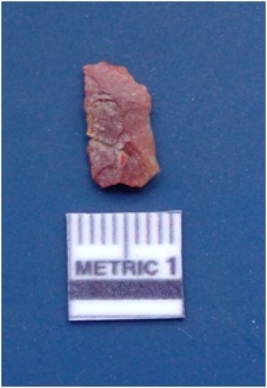 | Description / विवरण | It is a jasper fragment. Having prominent flake scars on the surface with ripples visible on it. Heat treatment done on it. It has sharp lateral margins with pointed ends. The fragment has positive bulb of percussion with erailuer feature. |