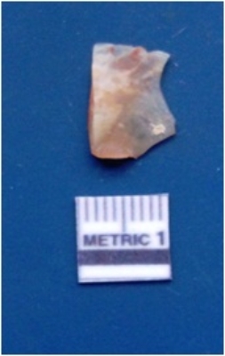 | Description / विवरण | It is a agate fragment. Having prominent flake scars on the surface with ripples visible on it. Heat treatment done on it. It has sharp lateral margins with pointed ends. The fragment has positive bulb of percussion with erailuer feature. |
