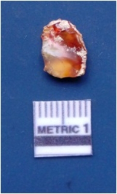 | Description / विवरण | It is a chalcedony fragment, having one side covered with cortex. Having bulb on the ventral side flake scars on the surface with sharp edges. |