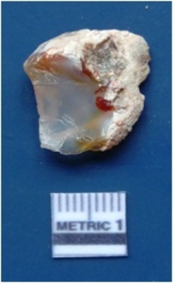 | Description / विवरण | It is a chalcedony fragment, having bulb of percussion on the ventral side. Flake ridges on the surface. Cortex on one side of the surface. |