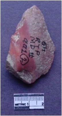 | Description / विवरण | It is a chert fragment having multiple flake scars on it. One of the side is having patinated due to depositional actions, maroonish in color. |