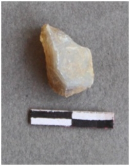 | Description / विवरण | The chalcedony piece is yellowish white, with a bulb of percussion and numerous secondary flakes. |