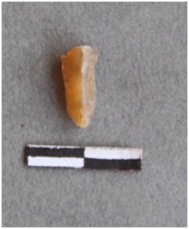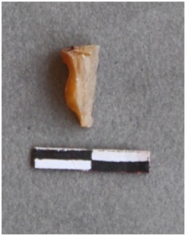 | Description / विवरण | The chalcedony piece is yellowish white, with a bulb of percussion and numerous secondary flakes. |