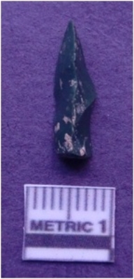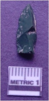 | Description / विवरण | It is a chert fragment having multiple flake ridges with ripples on the surface. Sharp edges and pointed ends, greenish in color. |