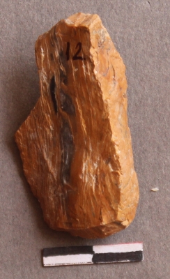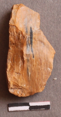 | Description / विवरण | It is a woody agate fragment. Sharp edges. Flake scars on the surface |