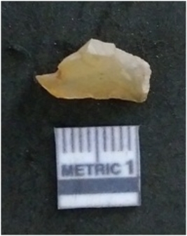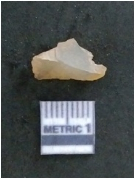 | Description / विवरण | It is a chalcedony flake, with a bulb of percussion on the ventral side. Cortex on one end. |