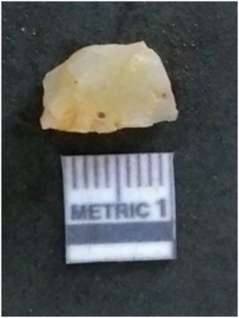 | Description / विवरण | It is a chalcedony flake, with a bulb of percussion on the ventral side. Cortex on one end. |