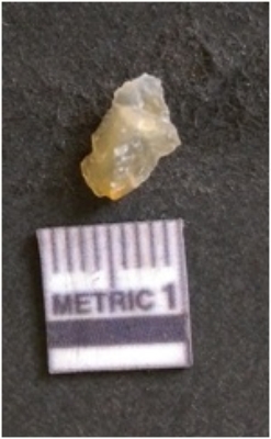 | Description / विवरण | The chalcedony flake is pale in color and translucent in appearance. The piece has s harp flaked ends and a bulbous end due to flaking. The flake has a crypto-crystalline silica matrix with translucent white in color. |