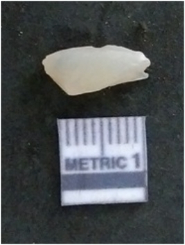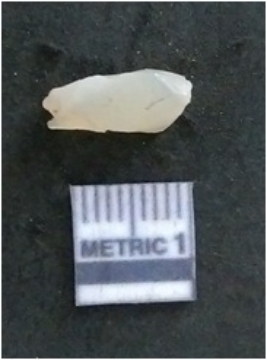 | Description / विवरण | It is a chalcedony flake, with a bulb of percussion on the ventral side. Cortex on one end. |