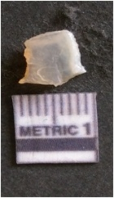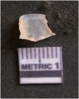 | Description / विवरण | The chalcedony flake is pale in color and translucent in appearance. The piece has s harp flaked ends and a bulbous end due to flaking. The flake has a crypto-crystalline silica matrix with translucent white in color. |