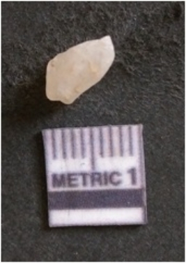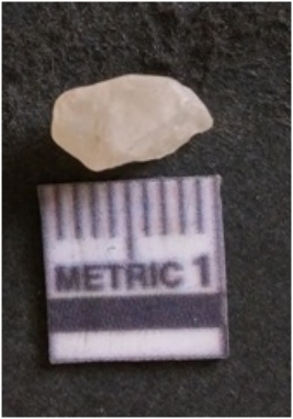 | Description / विवरण | The chalcedony flake is pale in color and translucent in appearance. The piece has s harp flaked ends and a bulbous end due to flaking. The flake has a crypto-crystalline silica matrix with translucent white in color. |