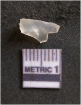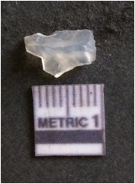 | Description / विवरण | The chalcedony flake is pale in color and translucent in appearance. The piece has s harp flaked ends and a bulbous end due to flaking. The flake has a crypto-crystalline silica matrix with translucent white in color. |