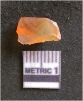 | Description / विवरण | The chalcedony flake is pale in color and translucent in appearance. The piece has s harp flaked ends and a bulbous end due to flaking. The flake has a crypto-crystalline silica matrix with reddish lint caused due to heat. |