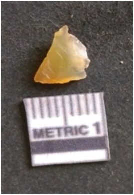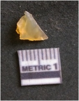 | Description / विवरण | The chalcedony flake is pale in color and translucent in appearance. The piece has s harp flaked ends and a bulbous end due to flaking. The flake has a crypto-crystalline silica matrix with reddish lint caused due to heat. |