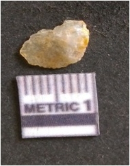 | Description / विवरण | The chalcedony flake is pale in color and translucent in appearance. The piece has s harp flaked ends and a bulbous end due to flaking. The flake has a crypto-crystalline silica matrix with reddish lint caused due to heat. |