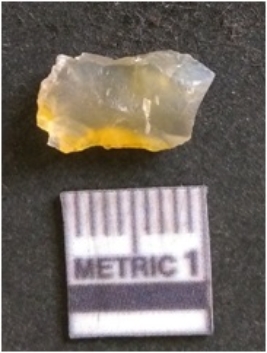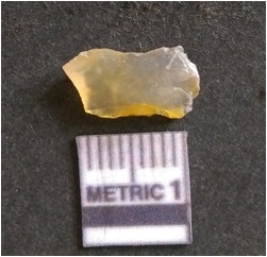 | Description / विवरण | The chalcedony flake is pale in color and translucent in appearance. The piece has s harp flaked ends and a bulbous end due to flaking. The flake has a crypto-crystalline silica matrix with reddish lint caused due to heat. |