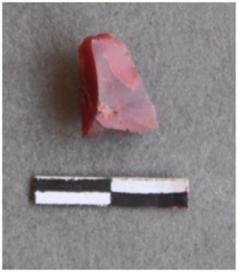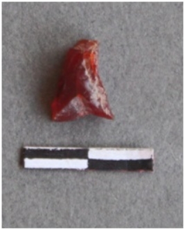 | Description / विवरण | It is a small carnelian flake. It is reddish in color, flake edges on the surface with ripple on it due to heavy percussion. |