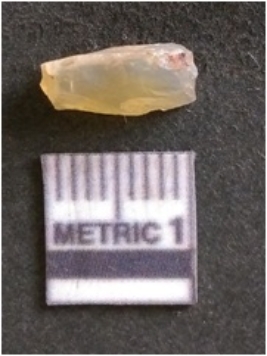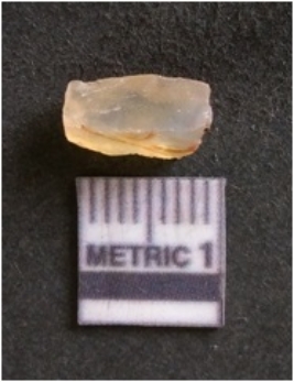 | Description / विवरण | The chalcedony flake is pale in color and translucent in appearance. The piece has s harp flaked ends and a bulbous end due to flaking. The flake has a crypto-crystalline silica matrix with reddish lint caused due to heat. |