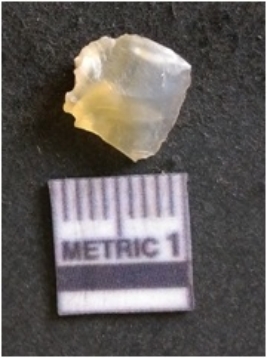 | Description / विवरण | The chalcedony flake is pale in color and translucent in appearance. The piece has s harp flaked ends and a bulbous end due to flaking. The flake has a crypto-crystalline silica matrix with reddish lint caused due to heat. |