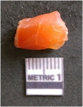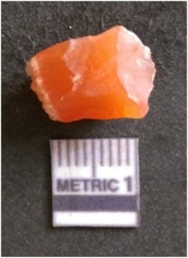 | Description / विवरण | The chalcedony flake is pale in color and translucent in appearance. The piece has s harp flaked ends and a bulbous end due to flaking. The flake has a crypto-crystalline silica matrix with reddish in color. |