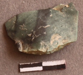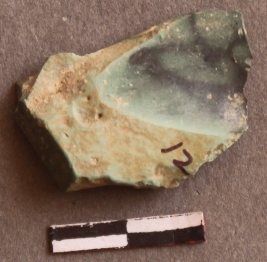 | Description / विवरण | This is lithic debitage. Chert stone fragment with prominent bulb of percussion a bit of cortex and flaks has been removed from one side. Copper sulphate impurities seen. |
