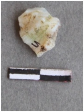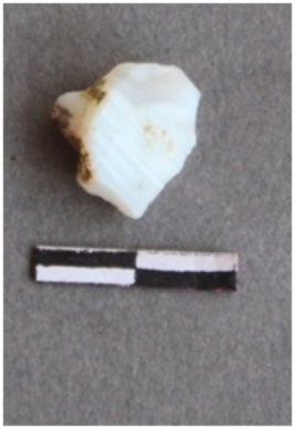 | Description / विवरण | It is chalcedony fragment. Whitish in color. It is a banded fragment. Flake scars on the surface. Cortex on one end. |