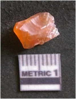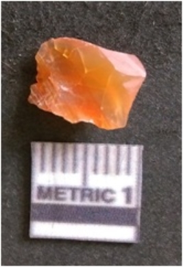 | Description / विवरण | The chalcedony flake is pale in color and translucent in appearance. The piece has s harp flaked ends and a bulbous end due to flaking. The flake has a crypto-crystalline silica matrix with reddish in color. |