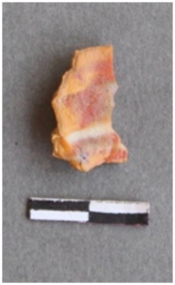 | Description / विवरण | It is a carnelian flake, with a striking platform with bulb of percussion on the ventral side. It is orangish in color, flake edges on the surface. Cortex on one end. |