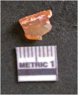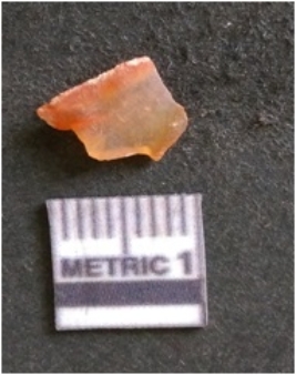 | Description / विवरण | The chalcedony flake is pale in color and translucent in appearance. The piece has s harp flaked ends and a bulbous end due to flaking. The flake has a crypto-crystalline silica matrix with reddish in color. |