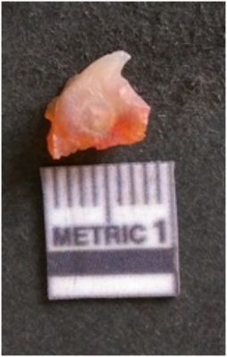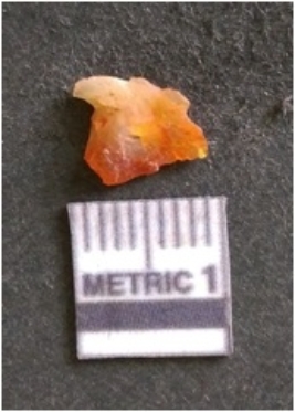 | Description / विवरण | The chalcedony flake is pale in color and translucent in appearance. The piece has s harp flaked ends and a bulbous end due to flaking. The flake has a crypto-crystalline silica matrix with reddish in color. |