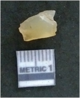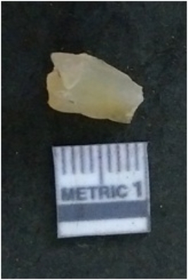 | Description / विवरण | It is a chalcedony flake, with a bulb of percussion on the ventral side. Cortex on one end. |